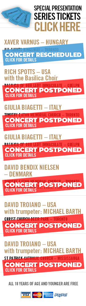 ORGANIX CONCERTS has been Toronto's on-going international organ festival series featuring the thrilling sounds of the magnificent pipe organ, "The King of Instruments." Unfortunately, The Corona Virus (COVID 19) has put an end to the 2020 season and will most likely change the manner of presentation for future concerts.